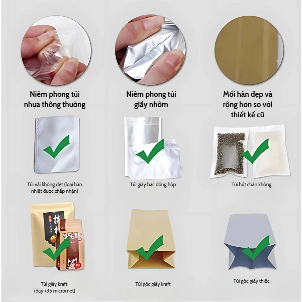 - Tương thích đa dạng: Hàn tốt các loại túi nilon, túi PP, PE và đặc biệt là túi Zip bạc.