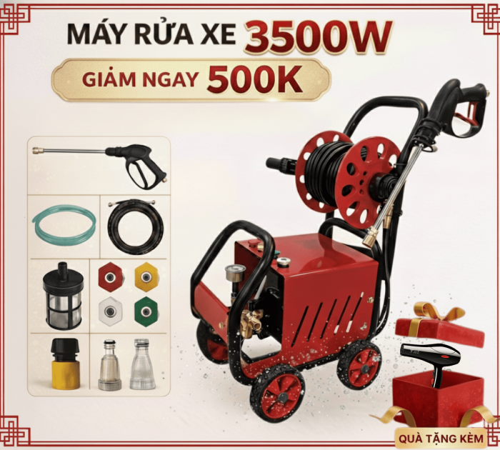 - Công suất vượt trội (3500W): Với mức công suất này, máy dễ dàng đánh bay các vết bẩn cứng đầu nhất như bùn đất khô lâu ngày, rêu xanh hay vết dầu mỡ công nghiệp.