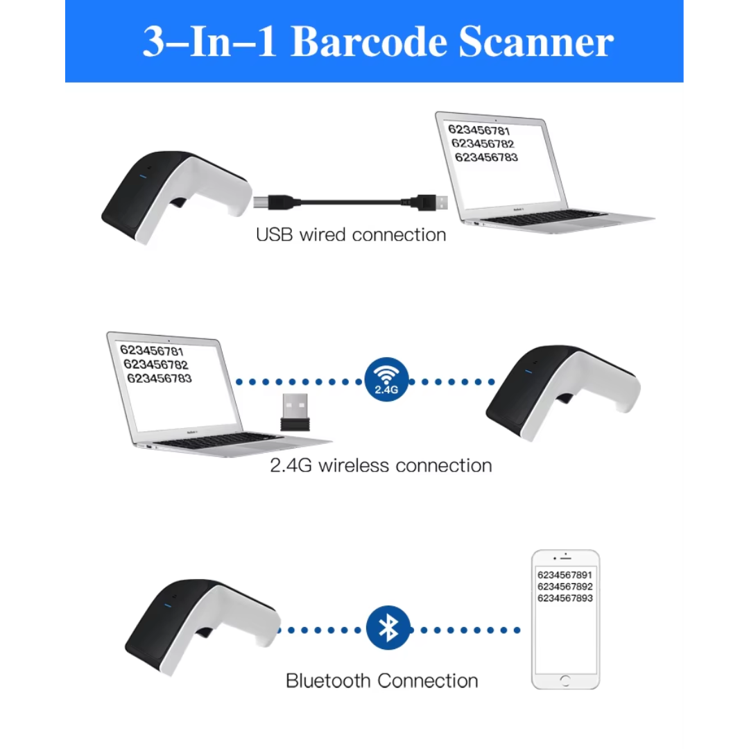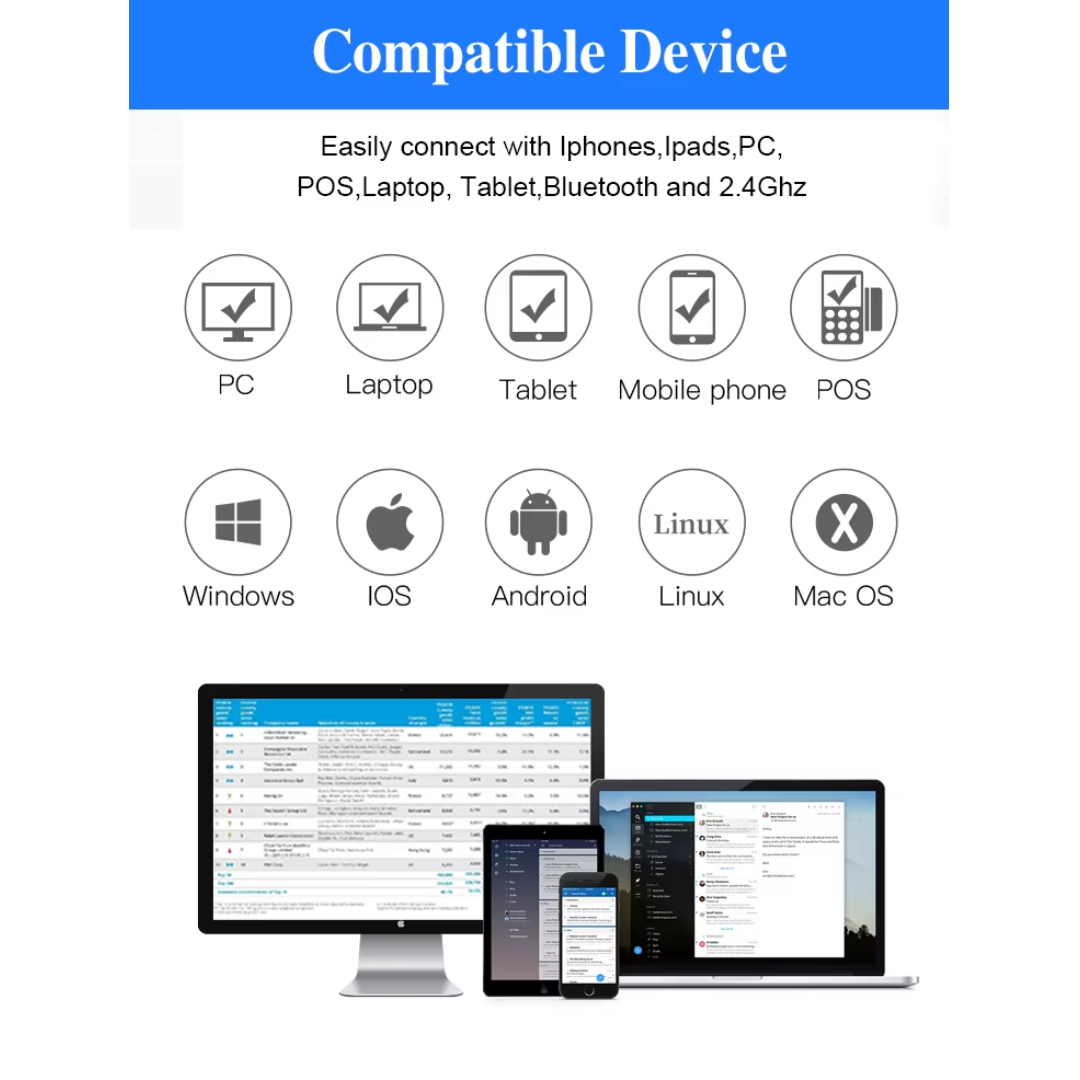 - Kết nối không dây tiện lợi: Hỗ trợ Bluetooth và USB Receiver, dễ dàng kết nối với máy tính, laptop, POS.